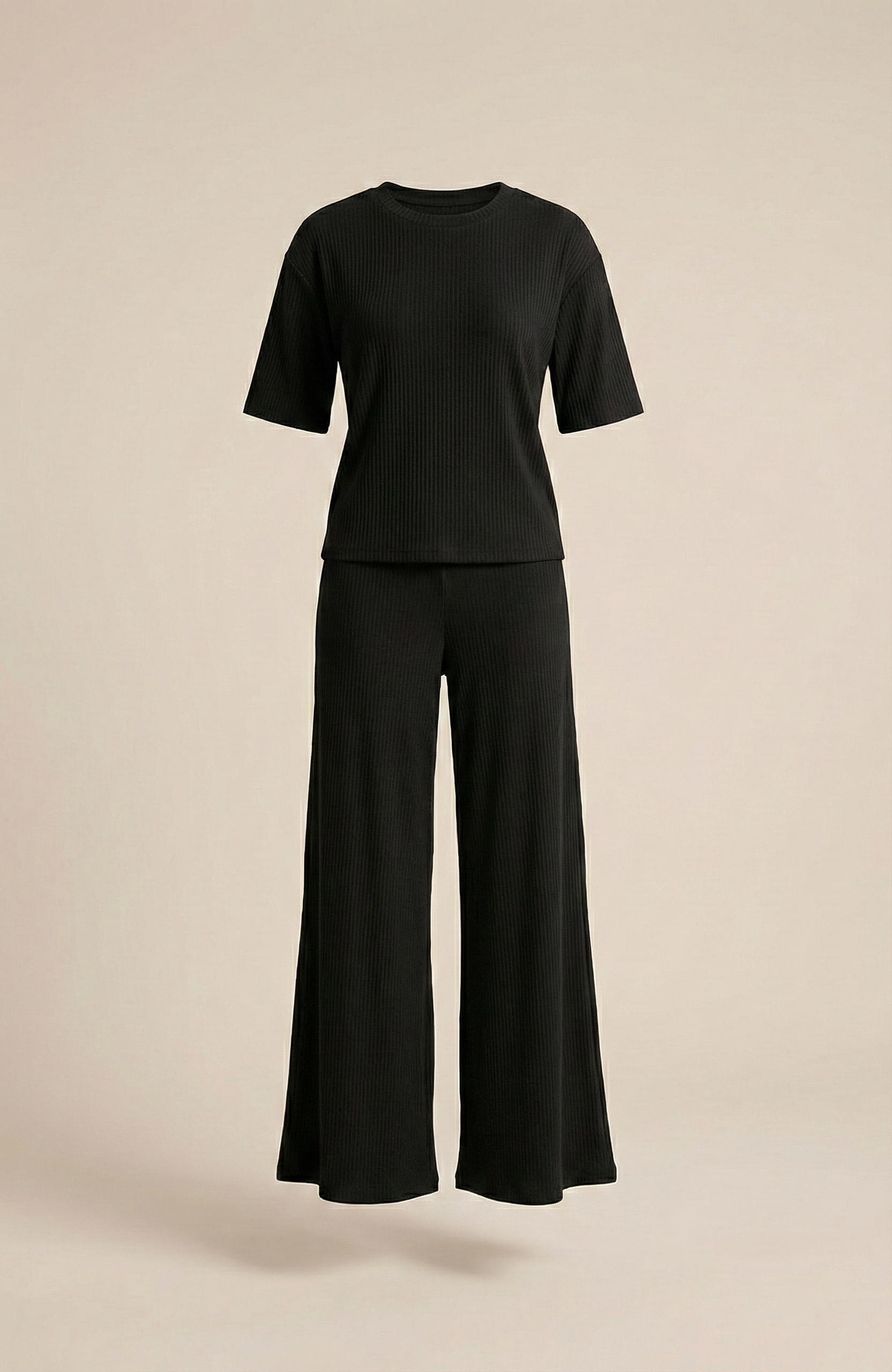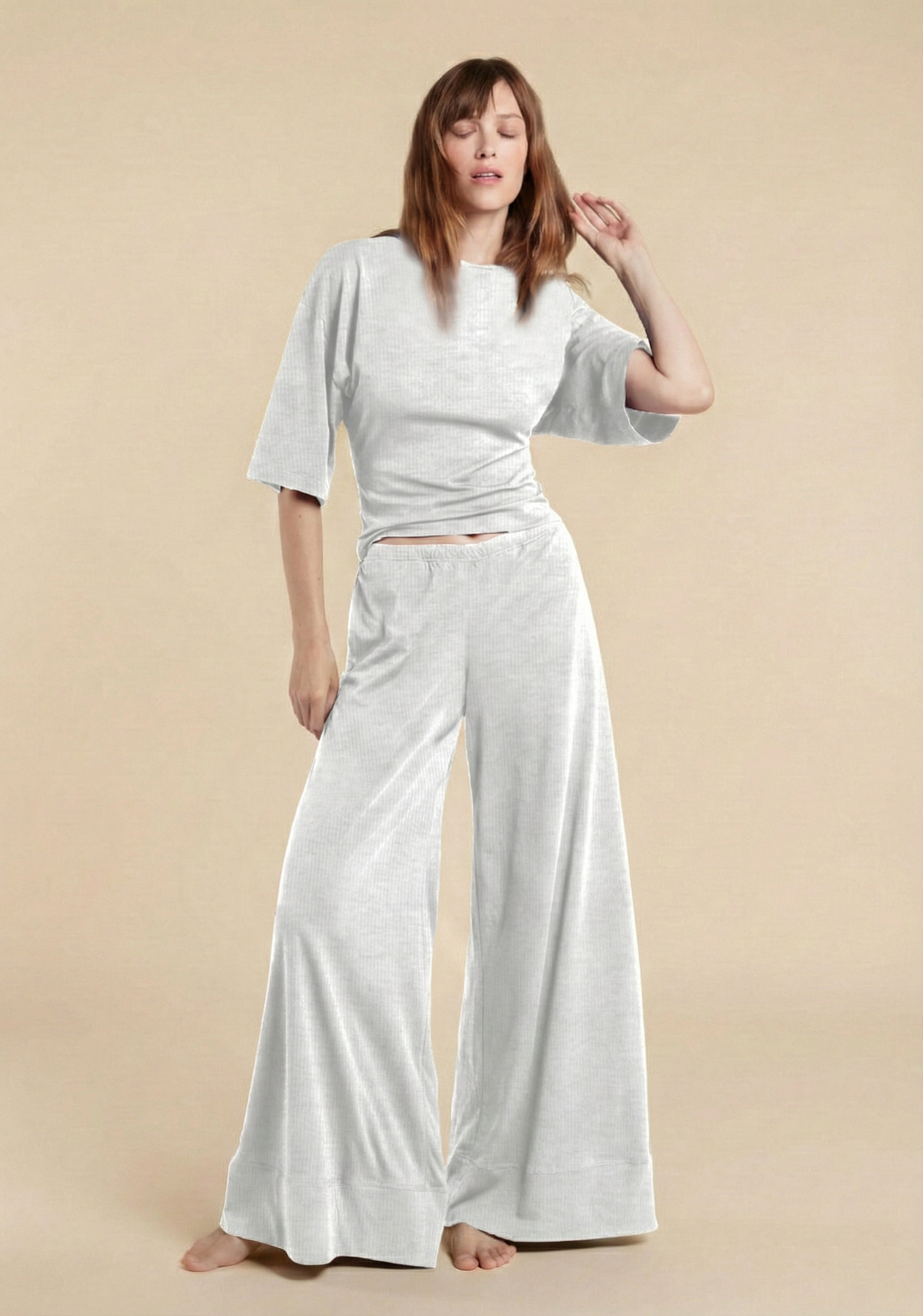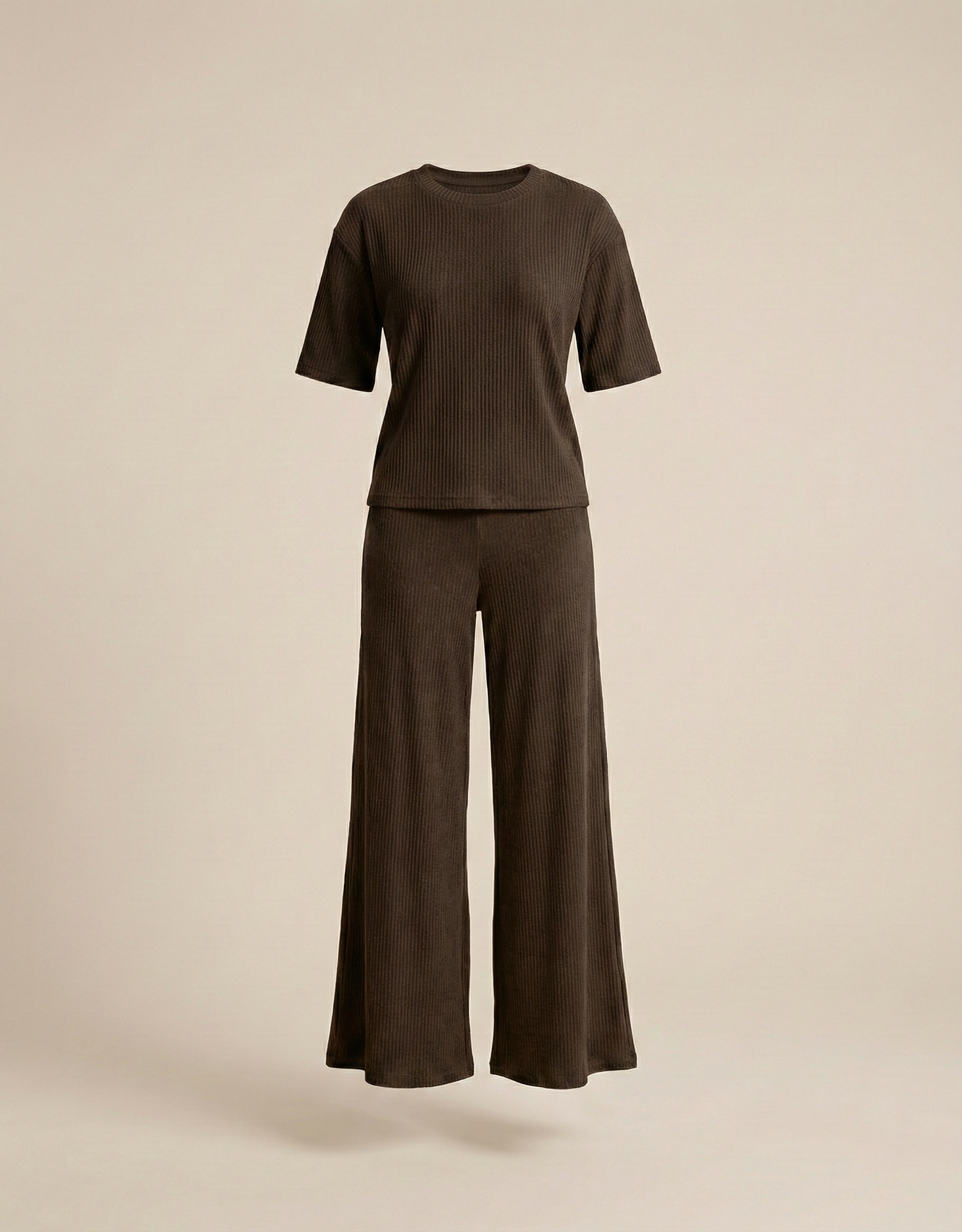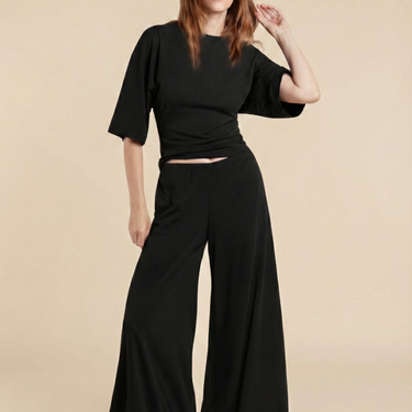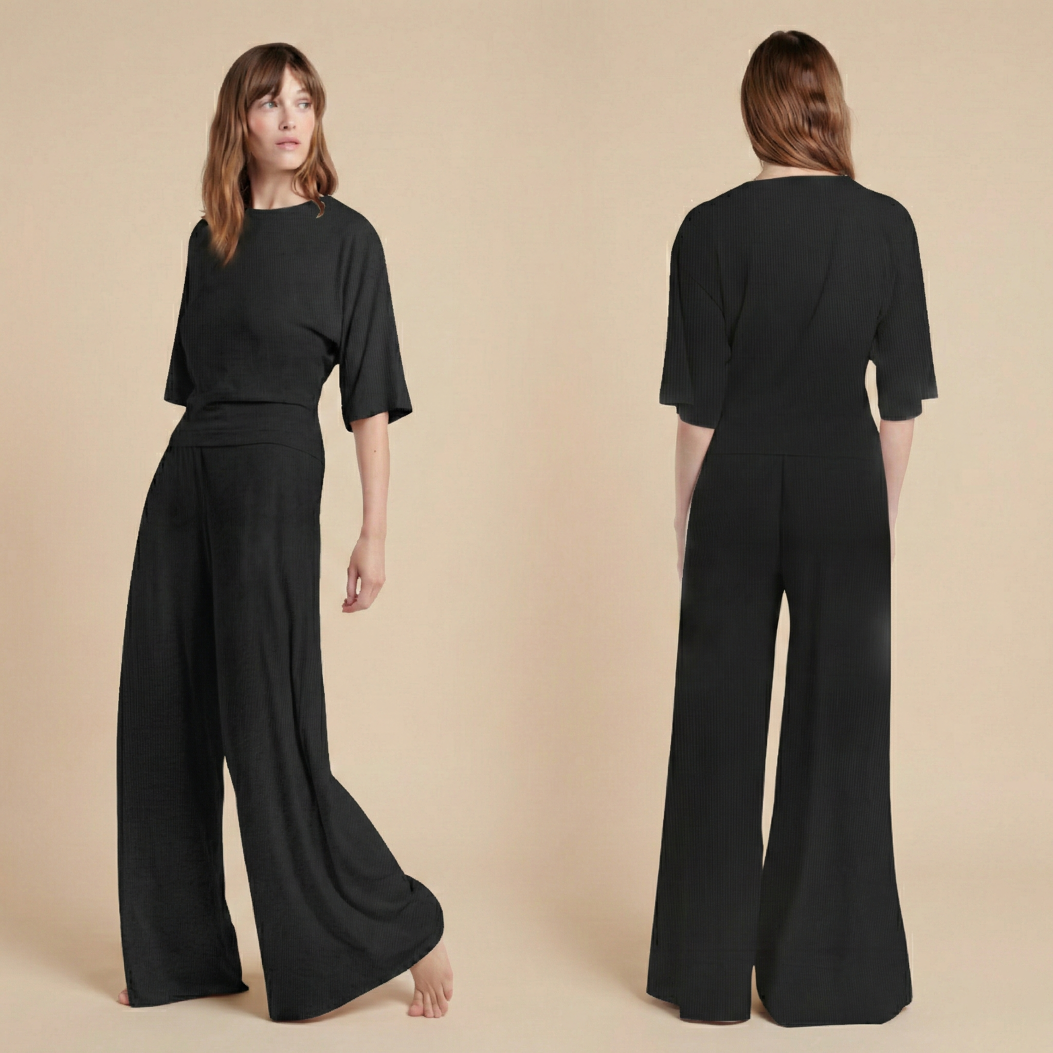 Soft two-piece set designed in a relaxed silhouette. Crafted from smooth polyester fabric, the set includes a three-quarter sleeve top paired with full-length trousers for an effortless everyday look. The minimalist solid-color design makes it easy to style for casual outings or elevated lounge wear.