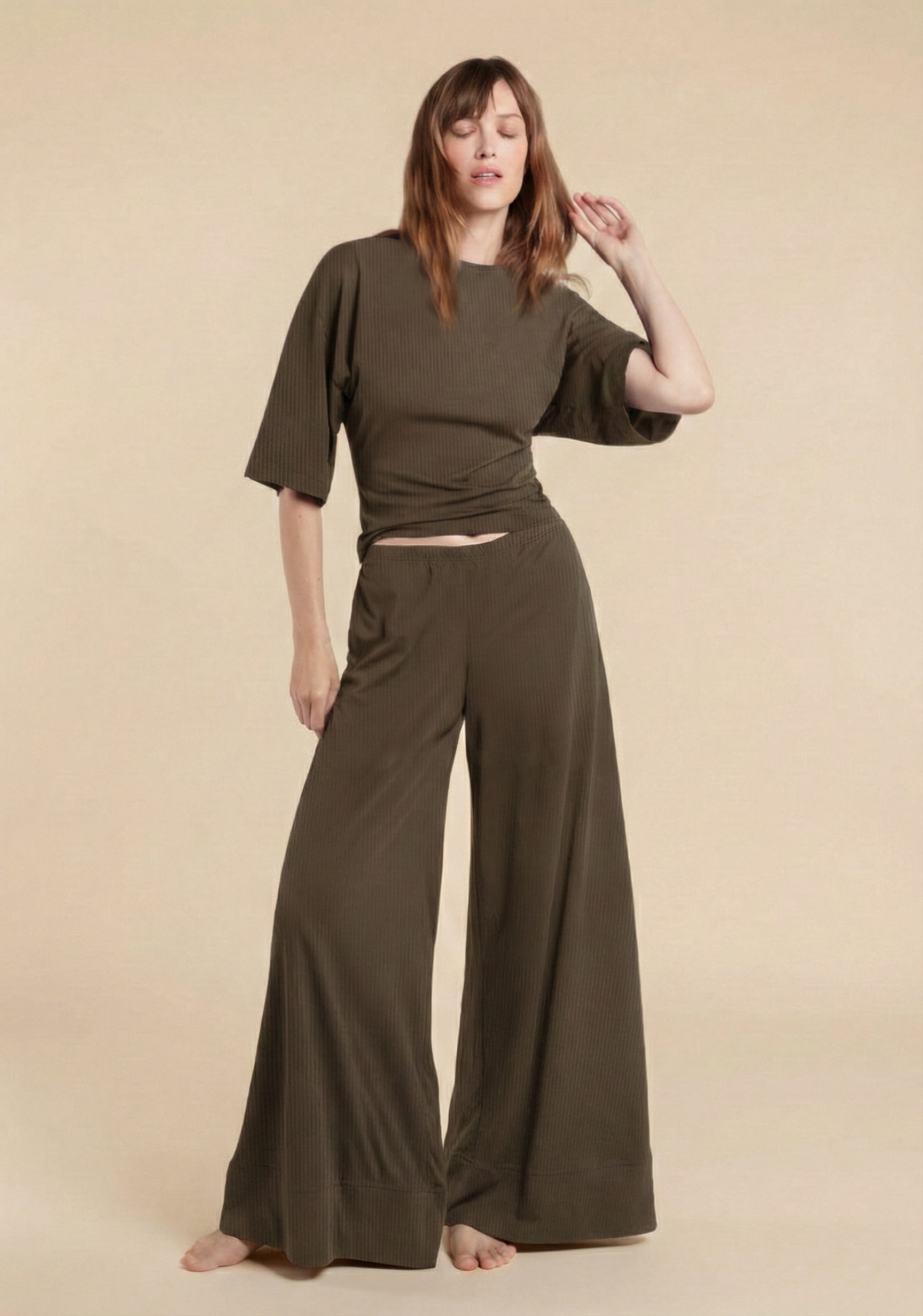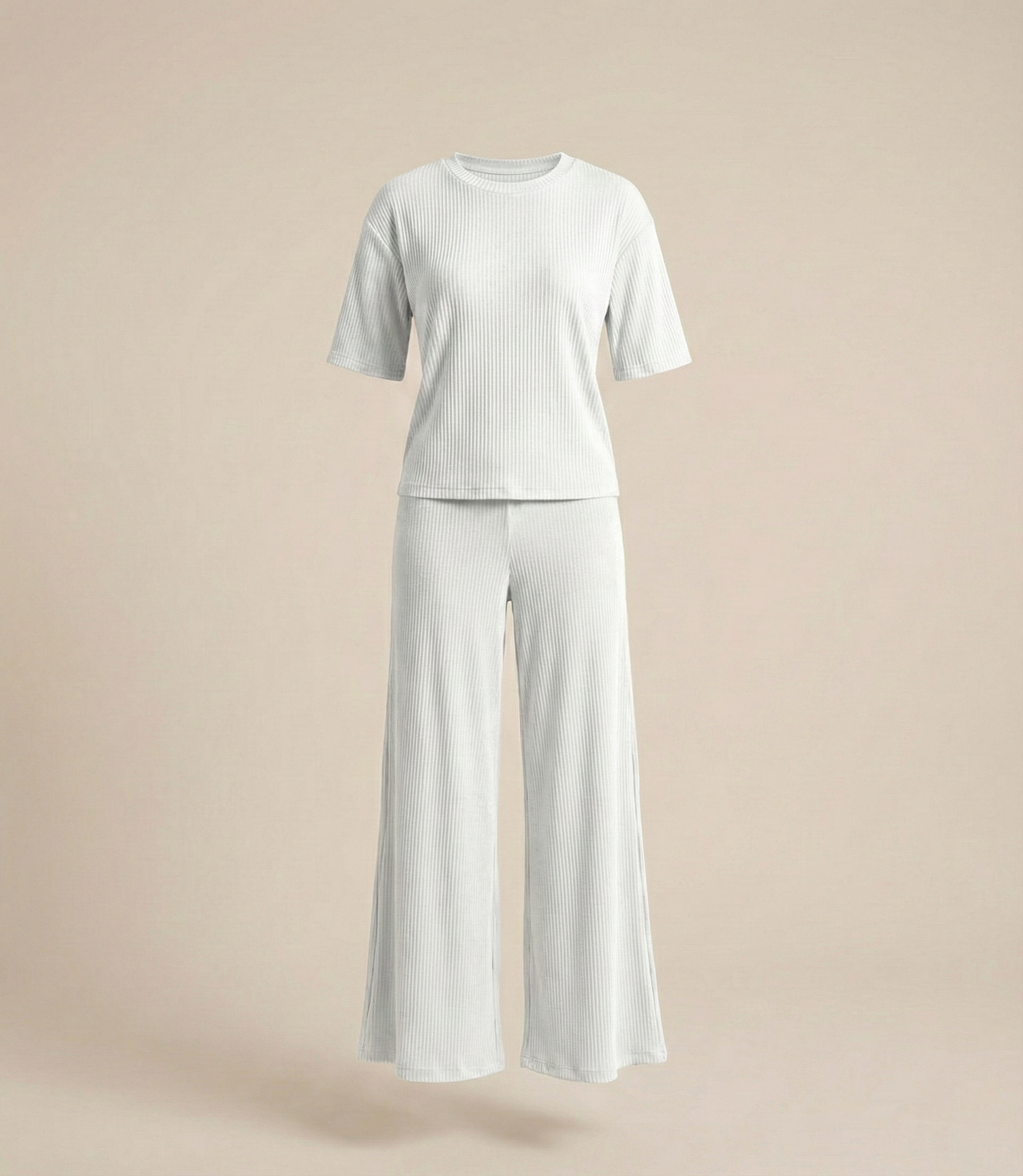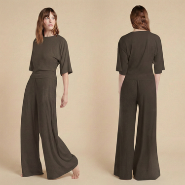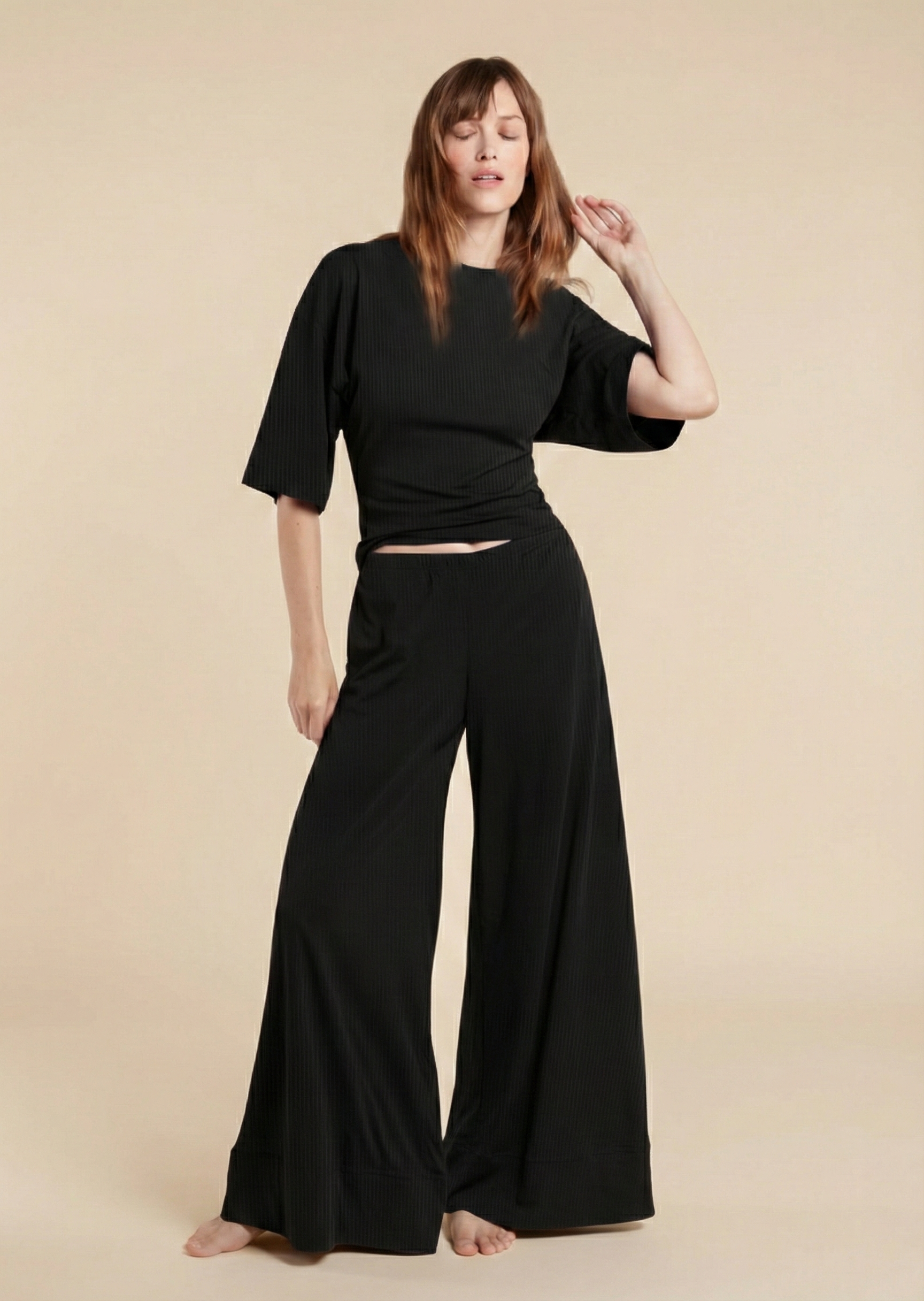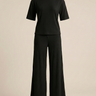 Soft two-piece set designed in a relaxed silhouette. Crafted from smooth polyester fabric, the set includes a three-quarter sleeve top paired with full-length trousers for an effortless everyday look. The minimalist solid-color design makes it easy to style for casual outings or elevated lounge wear.